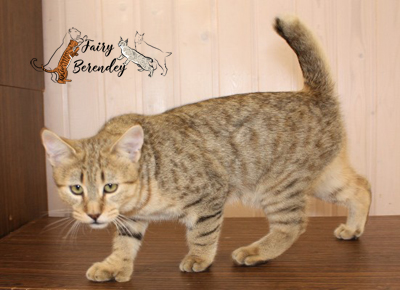 короткошерстная, многопалая, хвостик рысиной длины, густые рысьи кисточки на ушах, яркий золотой окрас шубки.